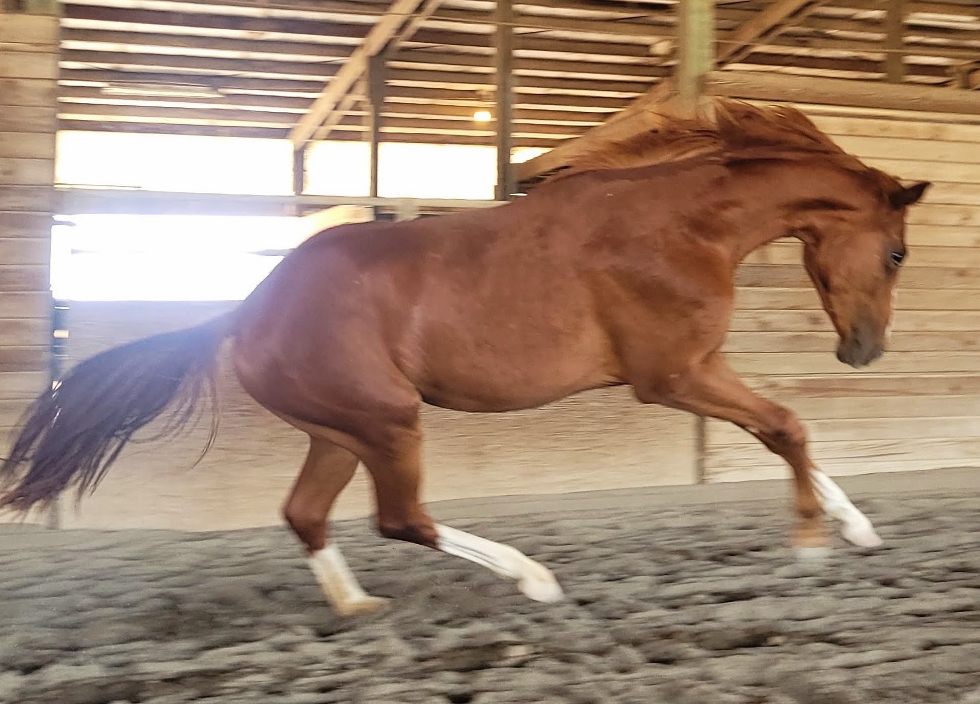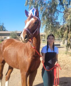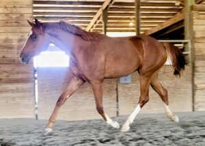 At 32 months, Duet stands just over 16.1 hands, making her likely to mature around 16.2. She is a sweet, sensitive, and forward horse who has had age-appropriate education; she leads, ties, bathes, and loads into a trailer. Duet has been handled by a novice teenager in an in-hand trail obstacle challenge!